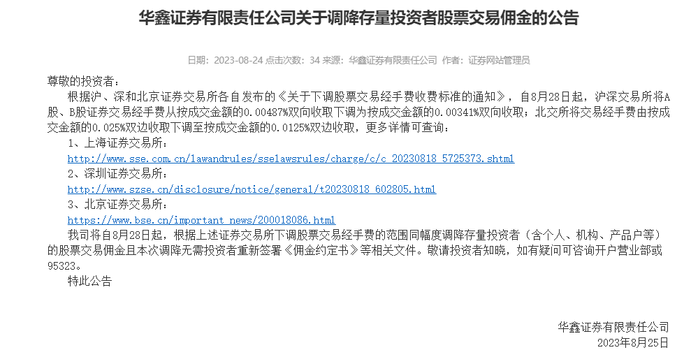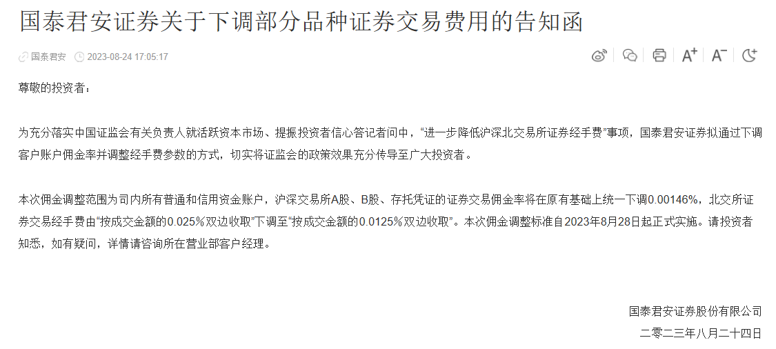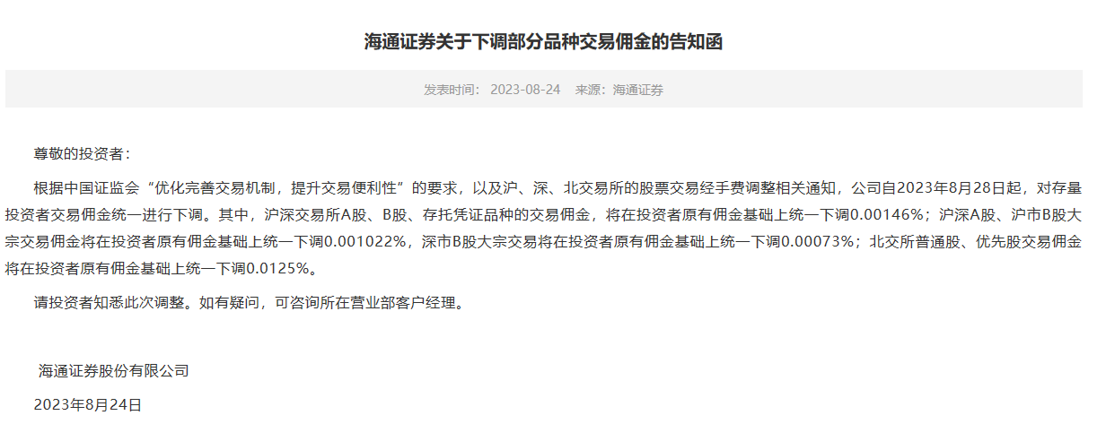 今天,国泰君安发布了下调交易佣金的相关通知,海通证券发布了下调交易佣金的相关通知,中信建投发布了下调交易佣金的相关通知,华鑫证券发布了下调交易佣金的相关通知,并且这些券商是陆续在官网发布的。