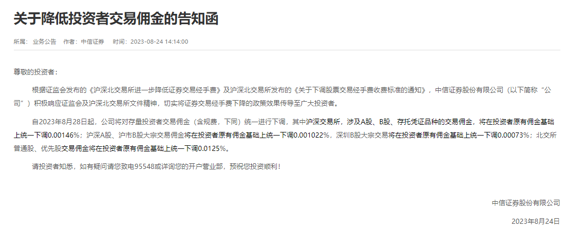 今日下午时分,中信证券发布了一份《关于降低投资者交易佣金的告知函》,该通知表明,自2023年8月28日起,公司会对存量投资者交易佣金(含规费)统一实施下调举措,其中对于沪深交易所来说,涉及A股、B股、存托凭证品种的交易佣金,将进行统一下调,下调幅度为0.00146%。