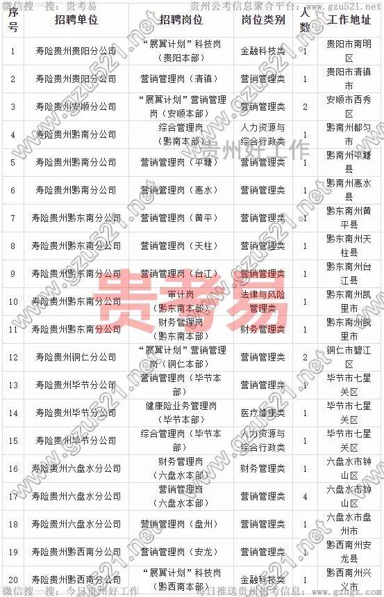 中国人寿保险股份有限公司贵州省分公司准备设立20个职位,招募25名大学毕业生,这些职位包括“展翼计划”下的营销管理方向、金融科技方向,以及人力资源与综合行政方向、法律与风险管理方向、财务管理方向、医疗健康方向等不同类型的工作,这些职位的办公地点将遍布全省的8个市州。“展翼计划”是公司着力构建的销售管理及金融科技领域新锐人才引进与培育体系,该项目借鉴了中国人寿长期积累的人才发展智慧,由总部进行宏观规划,各分支机构开展具体执行,借助多元化的发展途径,实施为期两到三年的个性化培养方案,确保参与“展翼计划”的职员能够快速成长为中国人寿青年骨干力量