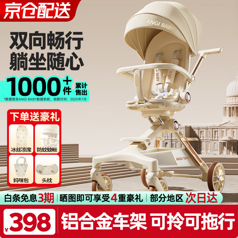 ANGI BABY儿童推车适合带娃外出,可以乘坐也可以平躺,车子轻便,方便折叠,采用双向设计,拥有高景观功能,能够让宝宝更好地观察四周,配备大尺寸遮阳棚,保护宝宝免受阳光直射,车子拥有六组减震系统,保证行驶平稳,推车设计轻巧,易于搬运,适用于0到6岁的宝宝使用,提供香槟金和大遮阳棚两种款式选择
