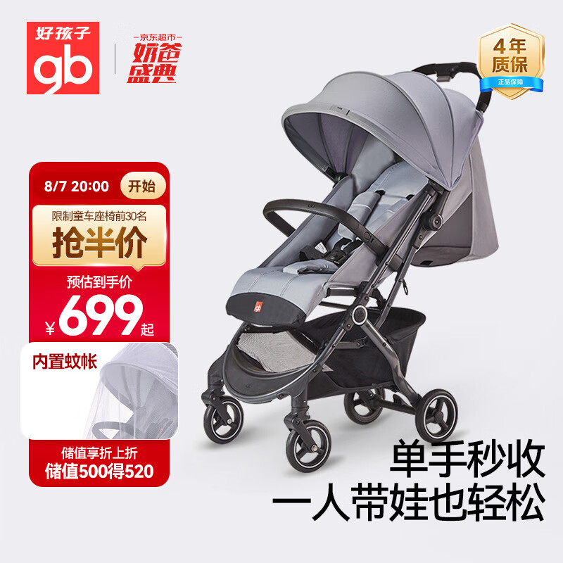 这款婴儿车名为好孩子小情书D619-B,专为0-3岁宝宝设计,既可乘坐也可躺卧,具备轻便折叠的特性,采用薄雾灰色调。