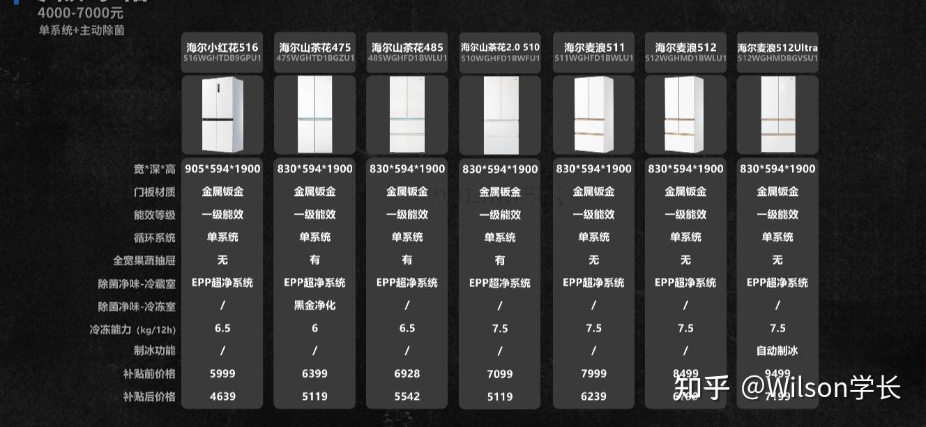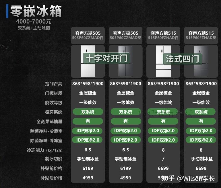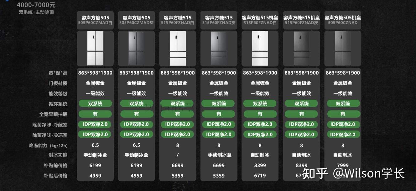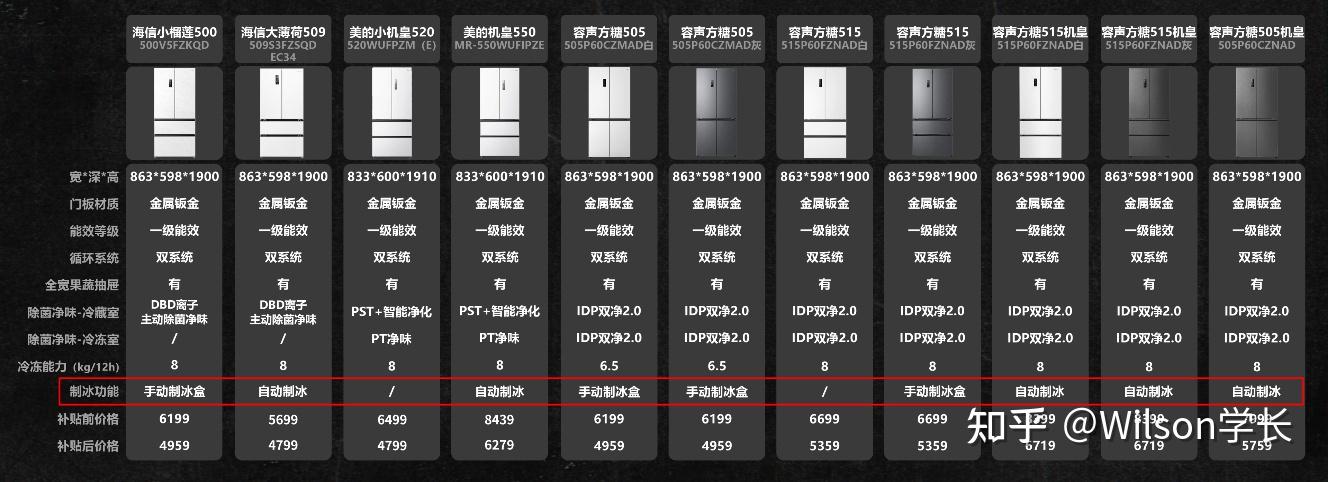 双系统,具备主动除菌功能,有手动制冰的选项或者不具备制冰功能的款式存在,如下有这几款,基本上每一款都有与之对应的带有自动制冰功能的型号,仅仅看表中这些款式的参数,似乎是差不多的,但是仔细研究起来,还是存在差异的: