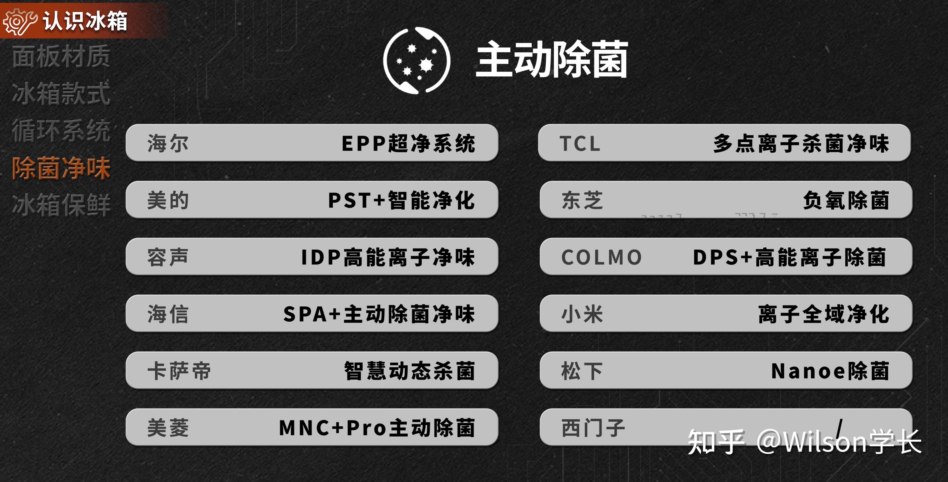 现有冰箱除菌净味存在两种类型,其一为主动除菌,于冰箱背部配置有通电的电离装置,可借由冷藏室室内风的循环持续实现主动除菌之成效,为使大家更明晰地与各品牌相对应,现将目前市面上各家具备主动除菌技术的类别汇总展示于下,有需求的使用者可采用截图方式进行留存 。