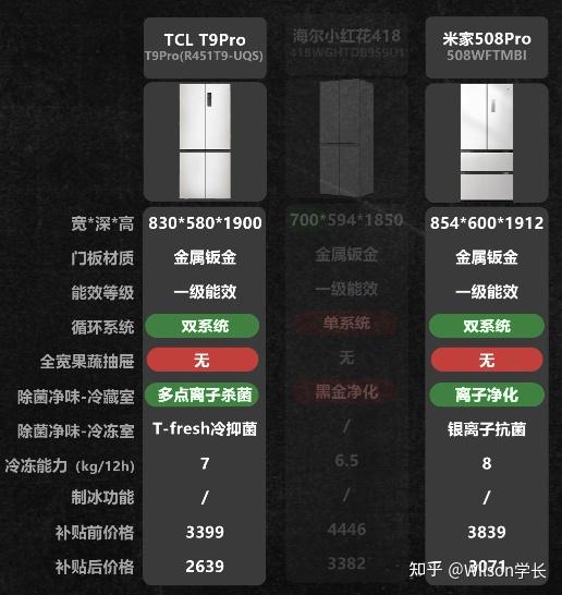 先进行一轮筛选,海尔小红花500,西门子497,它们都是单系统加上被动抑菌,性价比不算高;海尔418这款同样是单系统加上被动抑菌,然而宽度仅有700mm,在同价位的情况下,宽度为700mm的冰箱数量极为稀少,所以要是你家尺寸留错且愿意凑合,那就颇为合适,若想配置更佳,那就得增加费用了;在剩下的这5款当中,先看价位较低的TCL和小米这两款,这两个品牌算不上一线品牌,不过还好TCL拥有自己的生产线,小米508Pro大家都晓得是代工生产的,我们也调查了一下,代工厂是江苏上陵这家公司,但