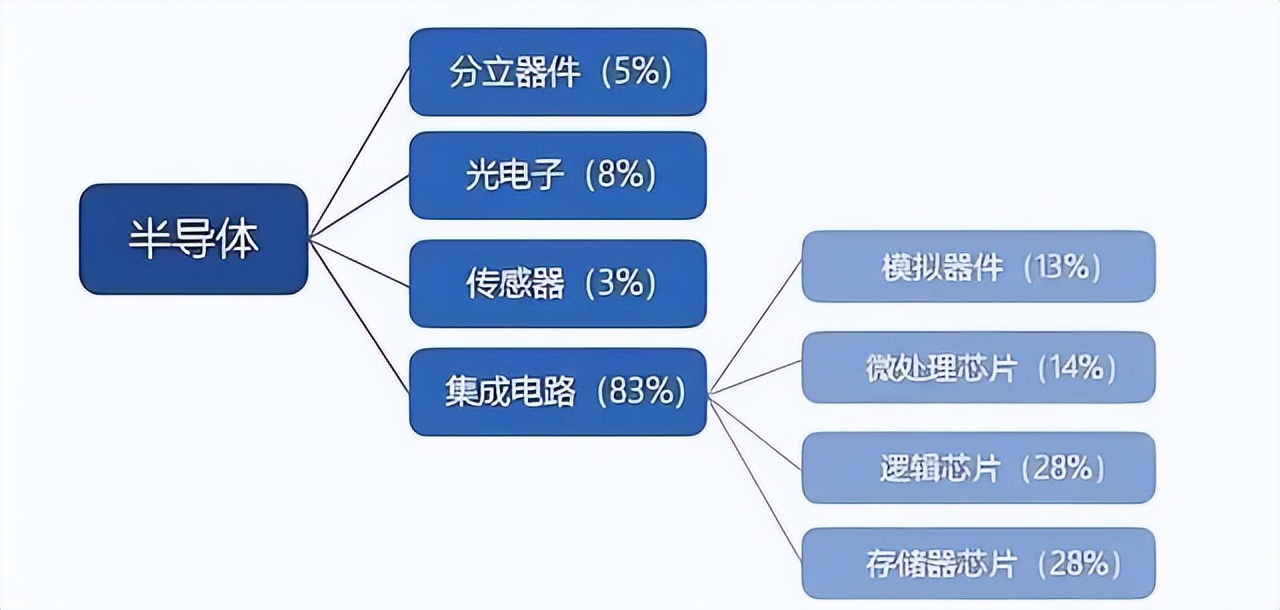 半导体依据产品分类能够划分成光电器件,或者传感器件、分立器件以及集成电路这四大类别,半导体价值量占比之中最高的是集成电路,而存储芯片以及逻辑芯片又是集成电路里面占比最为高的部分。