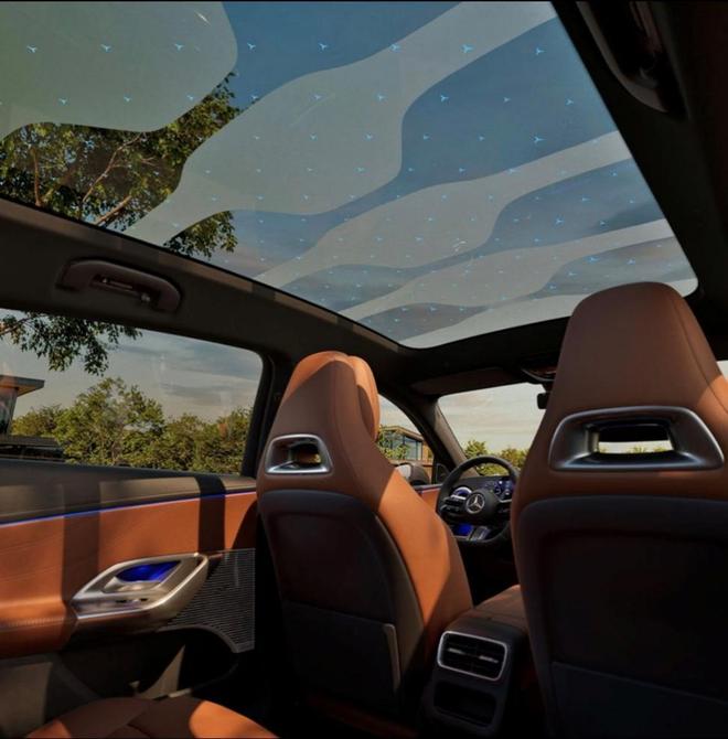 多区实现透明度独立调节的智控星徽全景式天幕在头顶,其有9个分区。天幕用3层镀银工艺,红外线隔绝率达99.4%,紫外线隔绝率为99.9%,还针对手机信号强化优化,隔热防晒同时能时刻在线。天幕里面嵌入162颗细小发光星徽,能和64色环境氛围灯同色调节,抬头看漫天星徽仿佛触手可及。Burmester® 4D环绕立体声音响系统包含多至19个扬声器与2个座椅振荡器,配合杜比全景声®营造沉浸式声音盛宴。6种“SoundExperience”整体式音效系统,是奔驰所独有的,此系统贯通汽车自靠近至离车,一共5大场景,涉及上车、驾驶、泊车充电以及离车这几个环节,赋予车辆温暖润泽,具备交流感的质地。