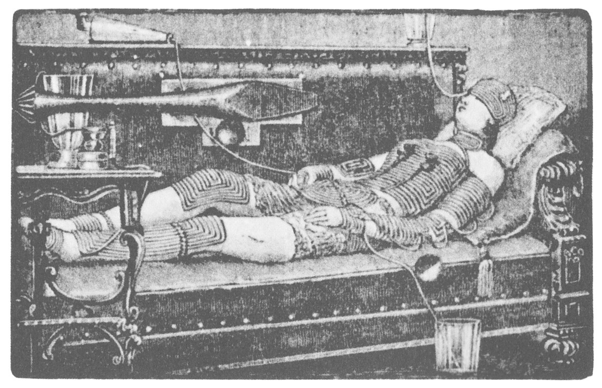 从这个角度来看,这种无所作为的状态会让人陷入难以理解的深层心理困境。十九世纪末期,卧床休息曾经是一种流行的康复手段,人们用它来调理神经衰弱、情绪失控以及各类身体不适。在托马斯·曼的小说《魔山》中,主人公躺在阳台上舒适的椅子上,享受着山间休养的安逸,这种平躺着的状态被赋予了生命本身的含义。沙发也充当了精神探索的载体,甚至被视为精神探索的代名词,并且存在名为“弗洛伊德”的沙发商品。病患在精神科医生的沙发上,进入半昏睡的境界,让医生得以探究他们最隐秘的深层意识。心理分析学专用卧具是人类发明的众多可调节床铺的一种,这种卧具被应用于多个方面和场合,例如实施手术、进行修剪以及协助生产等;与此同时,描绘休眠状态、幻象和恍惚感受的艺术作品也应运而生。1921年创作的画作《用肢体调制胶水》中,画家马克思·恩斯特运用了医学资料里的温疗图像,描绘了躺姿者的被动状态:有若干细管正将液体从其体内引出,同时又有某些事物正在向其体内灌入,这可能也映射出当代人对于科技干预卧姿与睡眠感受的思考。