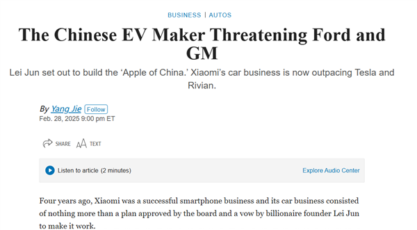 《华尔街日报》透露,雷军正在推进“国产版苹果”计划,小米的汽车板块如今规模已经超越特斯拉和 Rivian。同时,中国电动汽车行业也正对福特和通用汽车构成挑战。