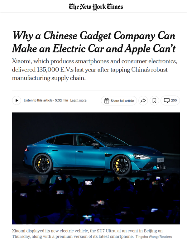 纽约时报提出疑问,中国的电子产品企业(小米)为何能够生产电动汽车,而苹果公司却不可以。