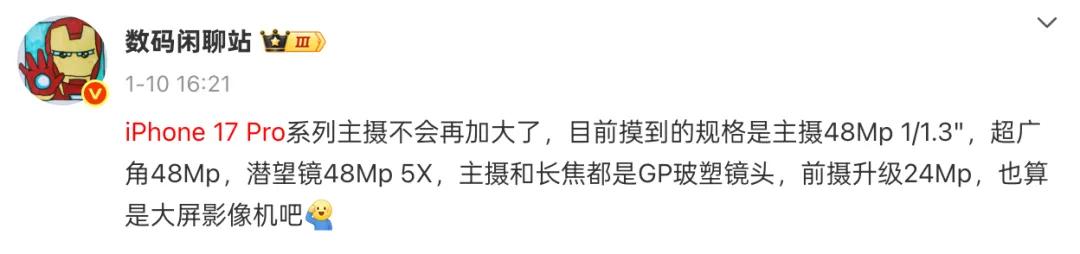 影像层面,根据微博博主@数码闲聊站披露的信息,此次Pro型号后置的三个镜头,包括主摄像头、超广角镜头以及潜望式长焦镜头,均提升至4800万像素级别,但原生镜头的焦段维持在5倍,这表明基本上无法配备大尺寸传感器。