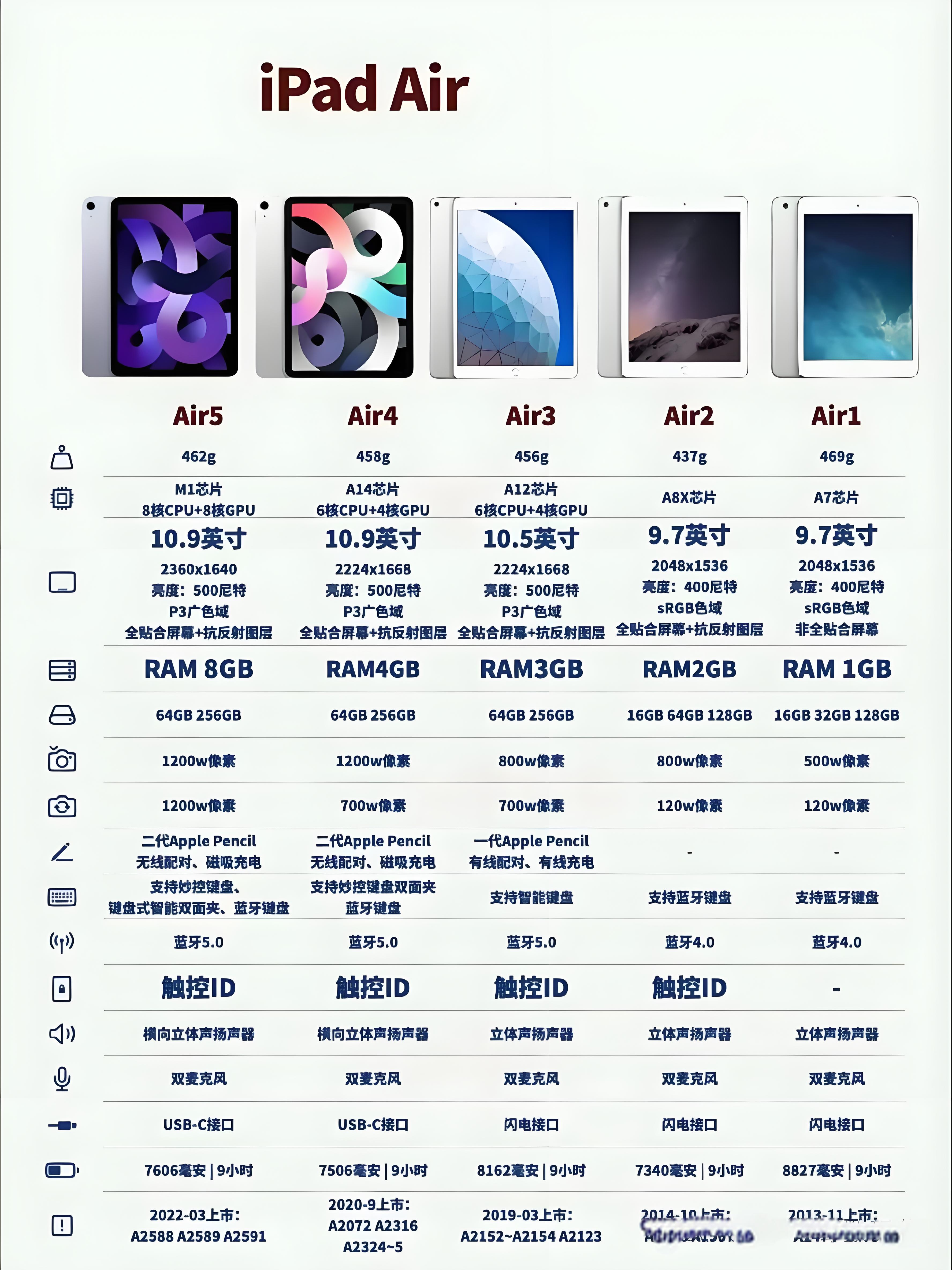 2022年推出的iPad Air(第五代)运用了Apple M1芯片,显著拉近了与Pro系列在性能上的距离,并且继续配备10.9英寸Liquid Retina显示屏,以及USB-C接口等特性。