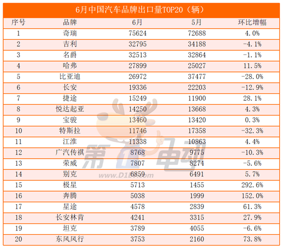 吉利汽车六月份的出口数量为3.2万辆,领先比亚迪和名爵,第一次获得亚军名次。吉利旗下总共有十种对外销售的车型,其中主要产品的出口数量与上个月相比急剧减少了34%,但是部分特定车型的出口表现有所提升。