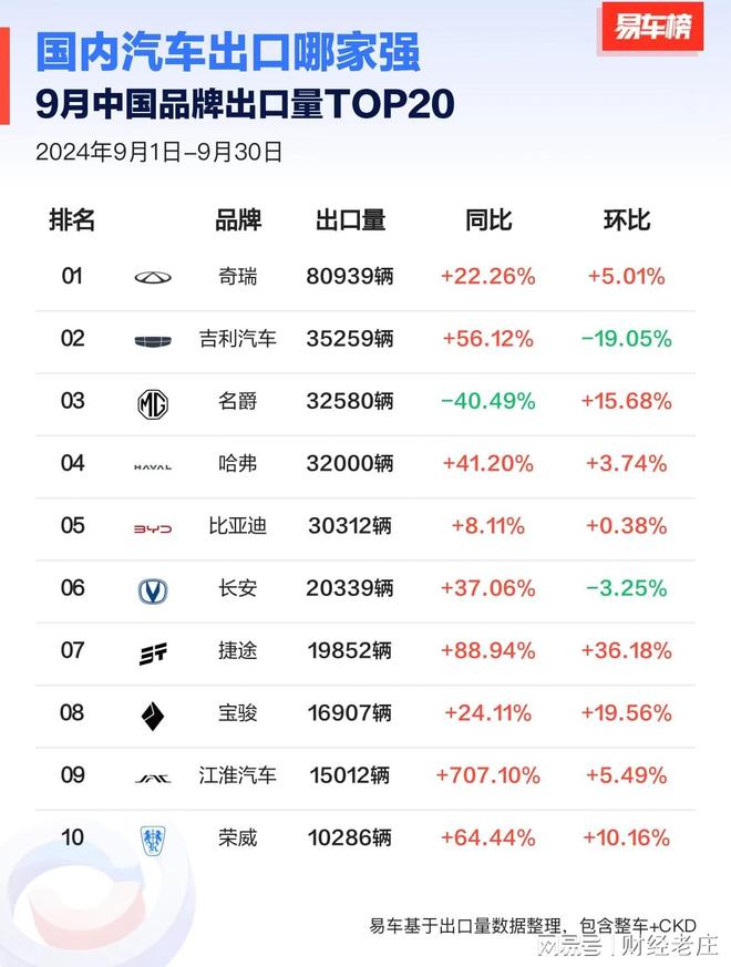 9月份中国汽车品牌出口数量排名中,奇瑞表现极其突出,遥遥领先,比亚迪位列第五。