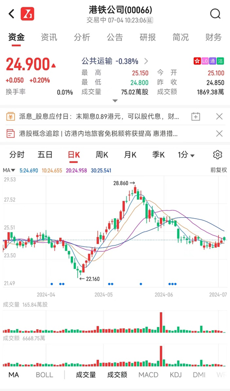 今年5月24日,港铁公司进行了除权操作,当天其股票价格降低了4.2%,第二天又出现了2.27%的上涨,然而随后股价持续走低,至今仍未恢复除权前的水平。