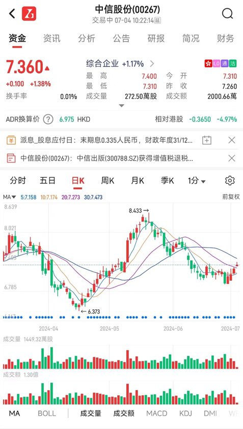 中信股份在6月27日经历除权,当天股价下跌了3.37%,第二天则上涨了2.16%,最终完成了填权动作。紧接着的7月2日,该股最高价已经超过了除权前的水平,标志着其成功收复了除权前的价格,实现了完整的填权过程。