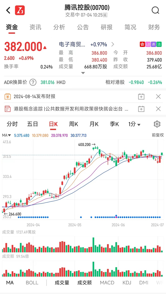 今年五月十七日,腾讯实施权益分派,当天股票开盘后曾一度上涨,随后有所回落,收盘时上涨了百分之零点三六,并未出现下跌情况,因此不存在下跌。第二天股价小幅波动,最终收于平盘状态。由于除权当天股价没有下跌,所以也就无从谈起所谓的“填权”现象。