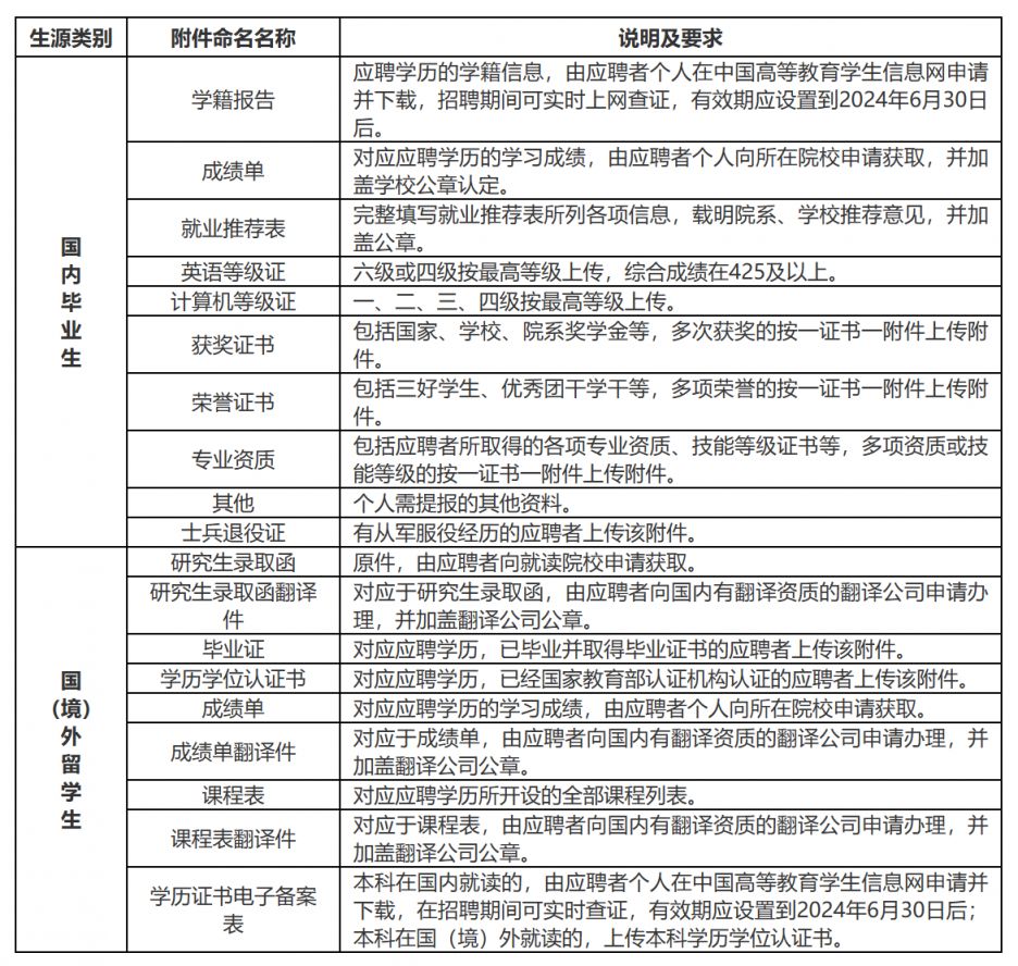 网上进行登记,应聘者需在国家电网有限公司人力资源招聘平台(网址:https://zhaopin.sgcc.com.cn)依照指引填写个人履历,提交相关材料,并选择申请的单位,整个批次申请的期限到2024年3月31日为止。所有文件必须单独作为附件上传,一个文件对应一个附件,若有多文件则可设置多个附件,附件名称需与所列名称保持一致,具体规范如下: