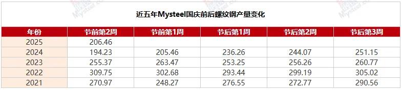 图表2:近五年Mysteel国庆前后螺纹钢产量变化