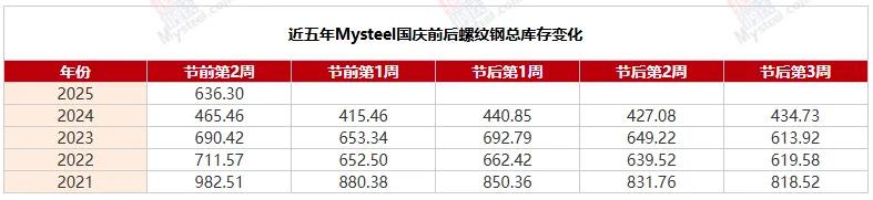 图表3:近五年Mysteel国庆前后螺纹钢总库存变化