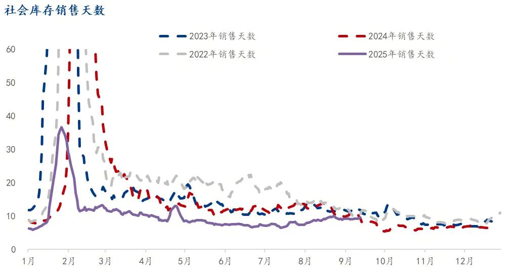 从库存周转率分析,在社会存货急剧增加的期间,库销比例仅略有上升,并且依然有缓冲空间,具体表现为从七月份的七天增至九月份的十天,这个数值超过了二零二四年的同期六点九七天,但小于二零二三年的同期十一天。