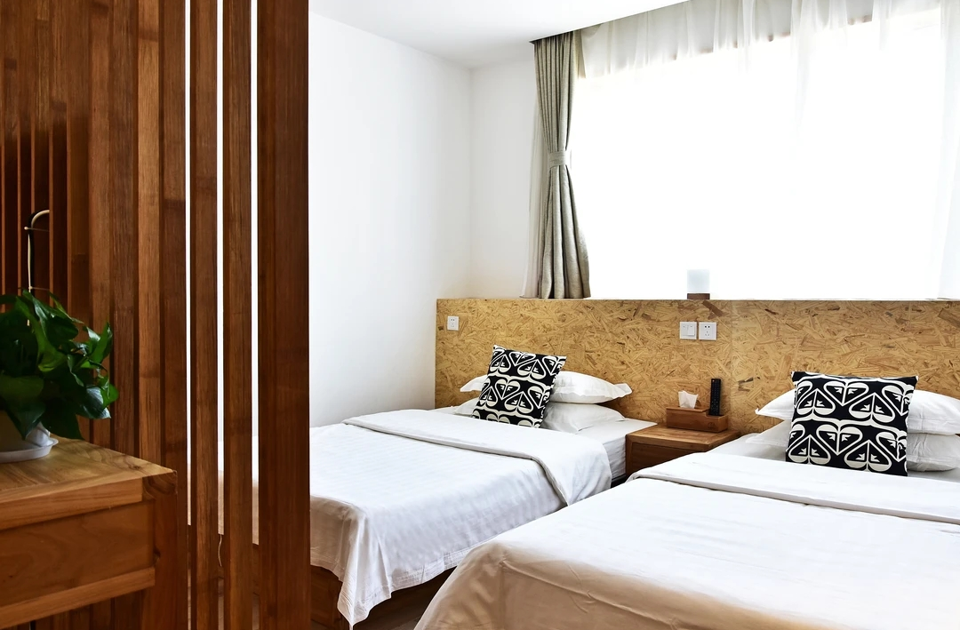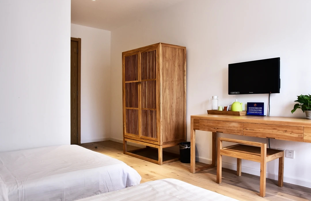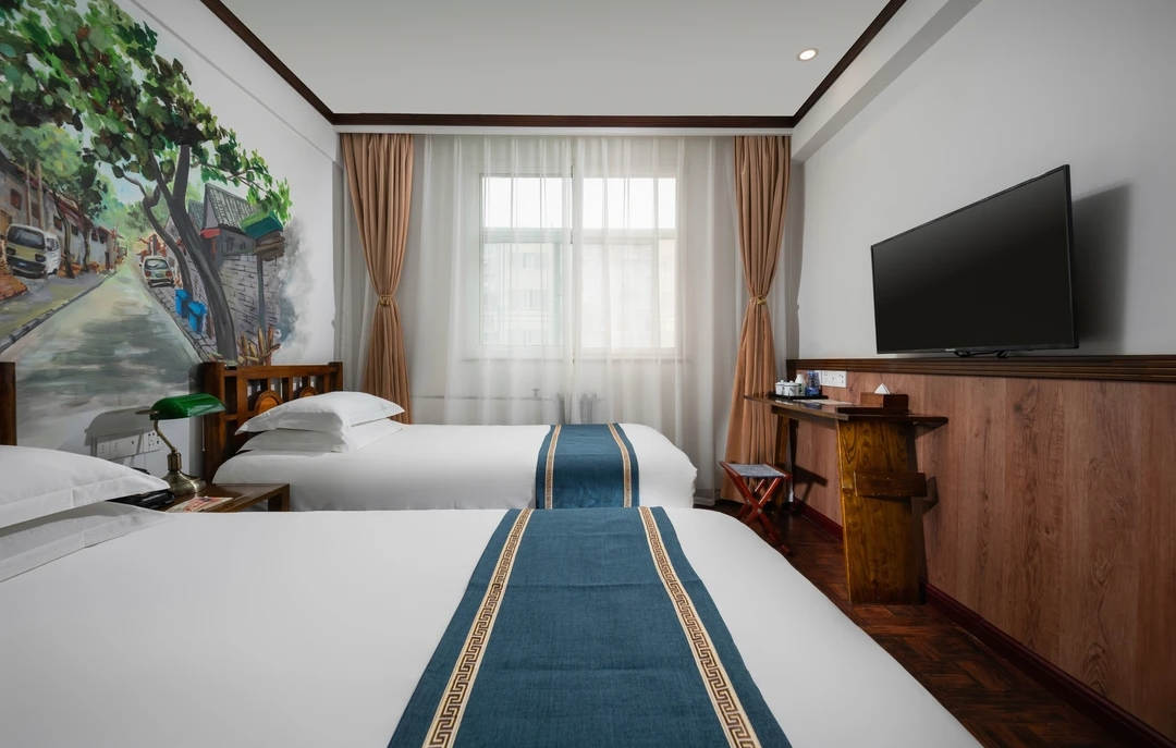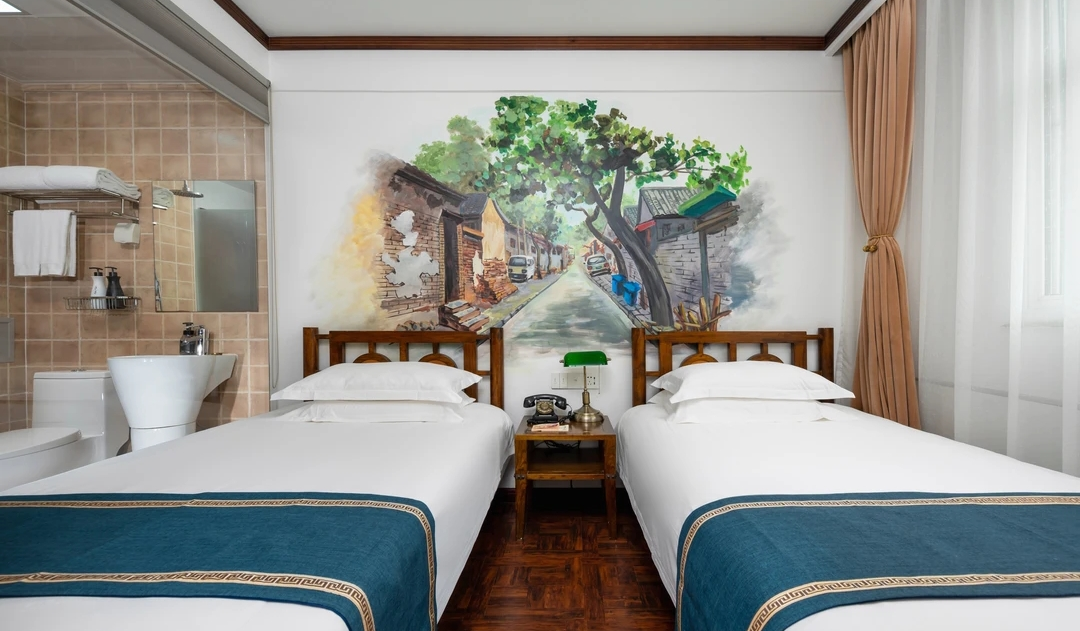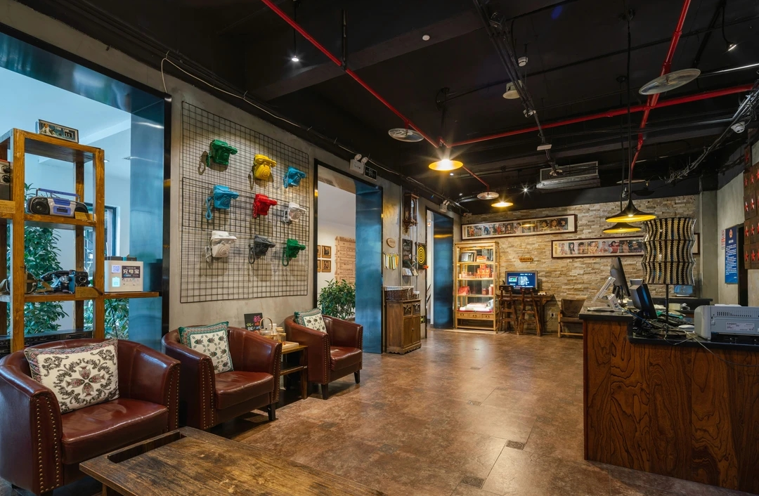 这个酒店在2019年完成装修,整体布置是复古文艺的样式,里面摆放着老榆木的实木家具,还有老式电话机和台灯,此外还有小人书以及套圈游戏机,这些物件都让人仿佛置身于上世纪。