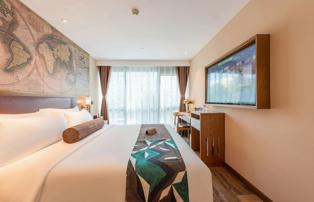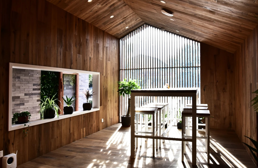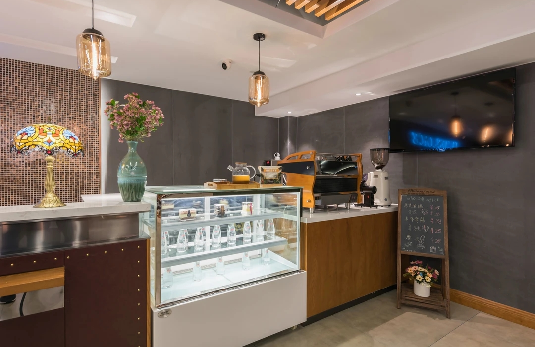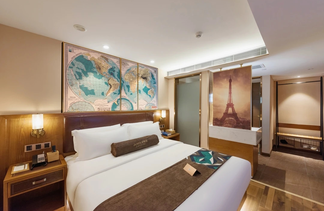 这个酒店在2019年完成装修,整体布置是复古文艺的样式,里面摆放着老榆木的实木家具,还有老式电话机和台灯,此外还有小人书以及套圈游戏机,这些物件都让人仿佛置身于上世纪。