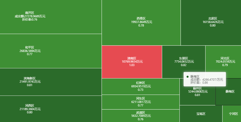 今年天津市各区平均折扣程度大多维持在八成上下,仅有两个区例外,其中津南区反常出现价格上扬现象,而宁河区折扣力度则低至六成九。