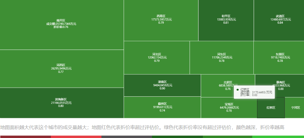 图8 展示了天津市2020年各个行政区域房屋成交时的价格折扣比例,该数据由海豚选房应用程序提供。