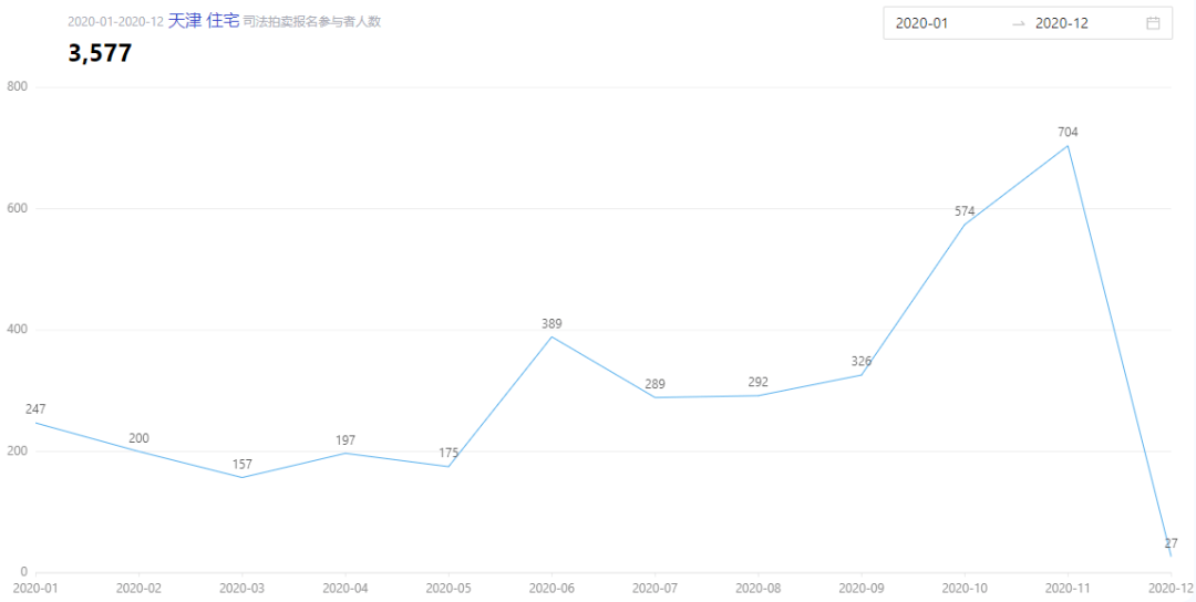 图7 展示了天津市在2020年参与司法拍卖的住宅数量,这些数据由海豚选房APP提供。