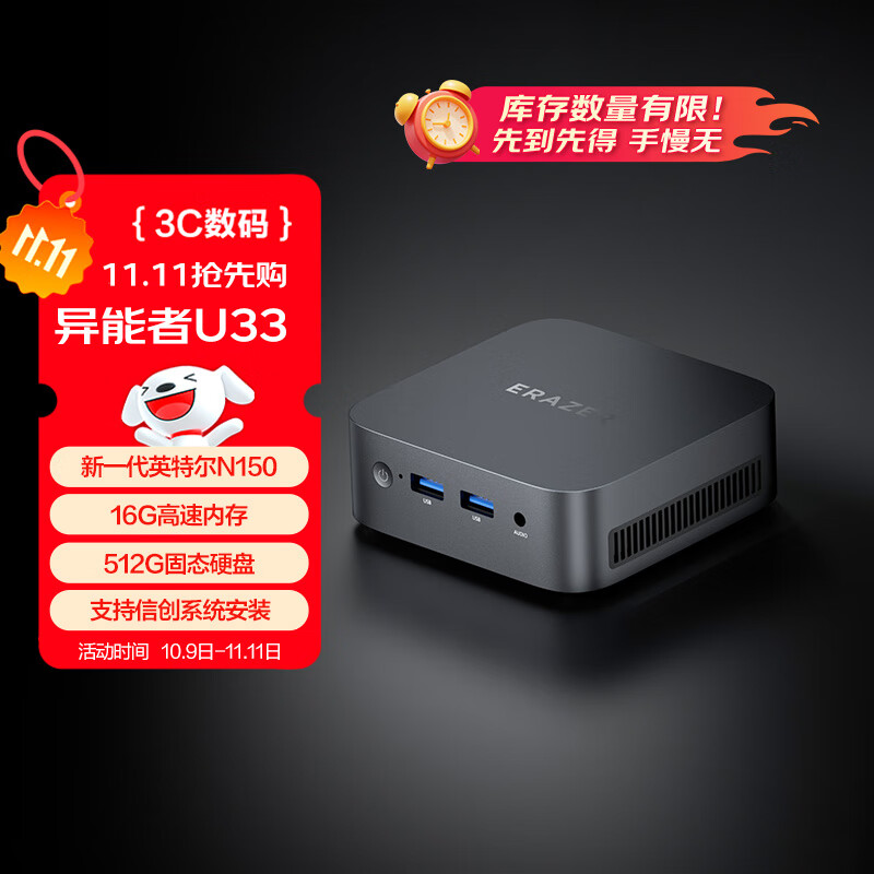 京东自营售卖的异能者U33mini迷你主机,属于联想生态品牌,是一款台式机商务办公电脑,享受国家补贴,可优惠20%