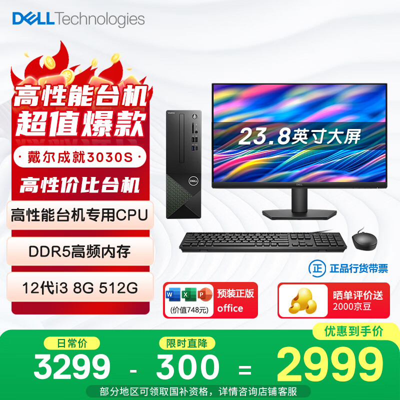 【京东自营】戴尔借助国家补助推出3030S台式电脑,配备23.8英寸防眩光显示屏,适用于办公及学习用途,同样胜任图像处理与软件开发工作