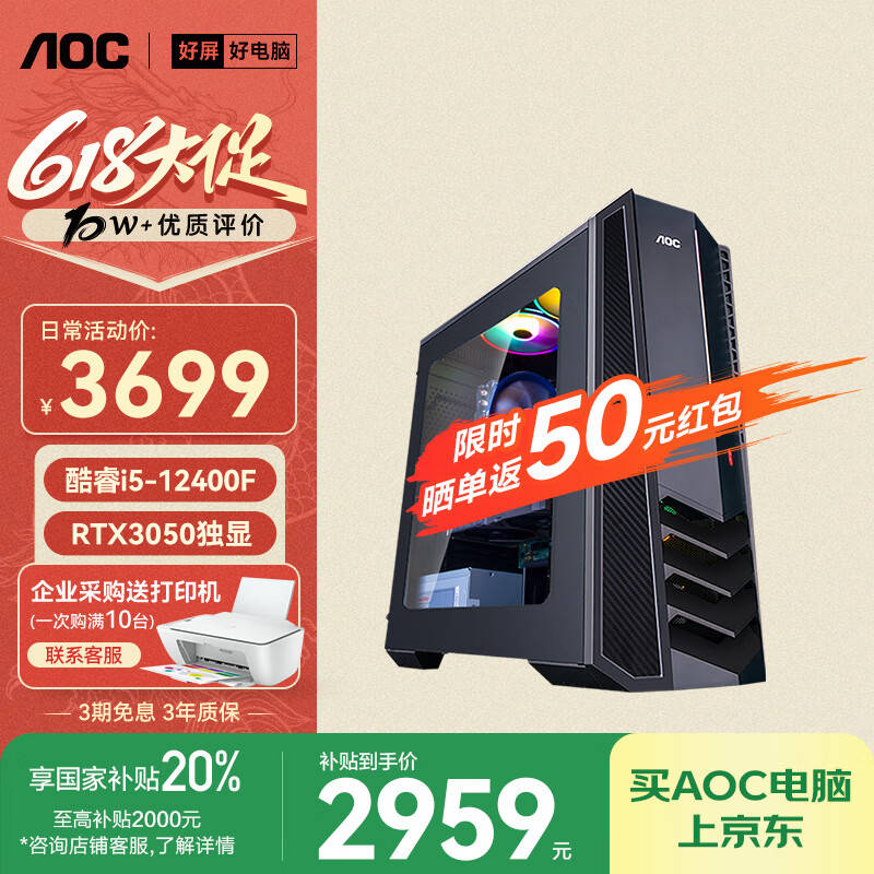 【京东自营】AOC享有国家补贴达百分之二十的卢916i512400F/RTX305016G/512G该款产品适合办公和设计用途