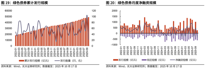 ESG金融产品监测:近期新推出了20支环保债券,当前发行总额已达到1267亿元。国内环保债券市场持续进步,到2025年10月17日,该市场累计发行总额合计48800亿元,累计发行数量达4206支。