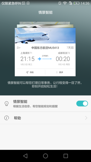 EMUI 3.1提供了一个功能,这个功能很人性化,叫“情景智能”,它有着卡片式情景智能提醒,能依据用户的订单短信、航班、火车、会议等信息生成事项卡片,与此同时,还能够按照用户的上下班习惯生成出行卡片,推送上下班提醒并提供路面交通情况,只是这个功能要花费一点时间去学习用户的上下班习惯。