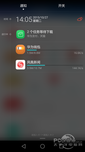 处于锁屏状态时,由上方向下发滑动屏幕的底部位置,能够呼出快捷工具栏。下拉菜单被划分成为两部分形态,其中一部分是通知管理中心,另一部分是快捷开关,这类使用方式相当便捷,做到了清楚明晰一眼得知 。