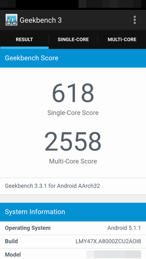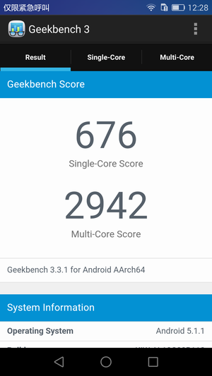 荣耀畅玩5X于Geekbench的得分情况是,单核得分为676,多核得分为2942,处于骁龙615机型里正常的得分区间。其得分比某款搭载高通骁龙615的手机更高,由此可见在软件方面优化程度较好。
