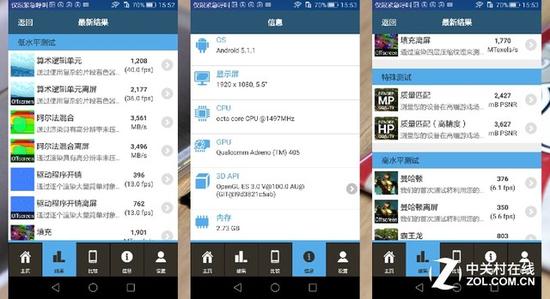 去看图形处理器方面的测试,能借助GFXbench 3.0的测试来瞧瞧。与此同时,能够瞧瞧这部手机的参数规格是,它运行的是Android 5.1.1操作系统,分辨率是1080P,处理器主频为1.5GHz,运行内存为3GB,实际在手机里可用的是2.73GB。