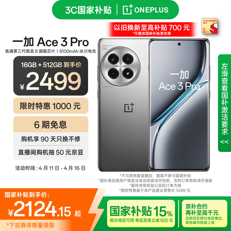 一加Ace3Pro,拥有16GB加512GB的存储,呈现钛空镜银外观,搭载第三代骁龙8旗舰芯片,配备冰川电池,享受国家补。