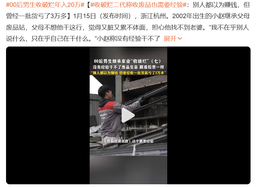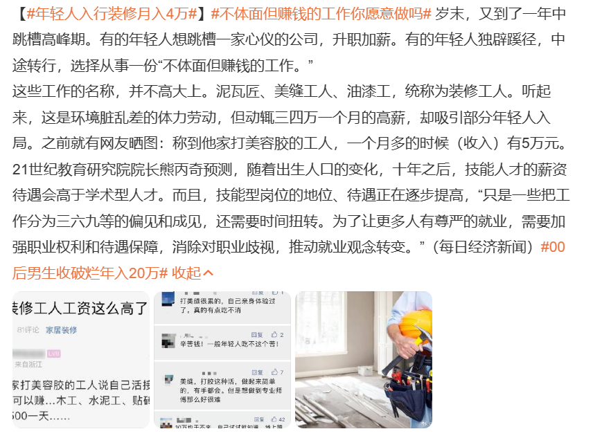 “00后男生收破烂年入20万”这个词条登上热搜时,大家还没从年轻人与废品行业,以及薪资水平带来的惊讶里缓过神,紧接着,“装修工月入三四万引年轻人入局”的话题又引发了热议。他们身处浙江,毫不掩饰自己对赚钱的渴望,说:“我就是因为想赚更多才选择做工人,靠自己的劳动挣钱,哪有什么难不难看的,我觉得都很光荣。”。