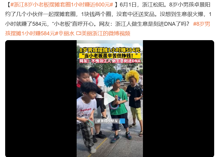 去年夏天,浙江松阳有个8岁小男孩,他自己摆起摊来开展套圈活动,其生意呈现出火爆的态势,在一小时的时间里,就赚到了将近600元,这使得网友大声呼喊着“浙江人做生意刻进DNA” 。