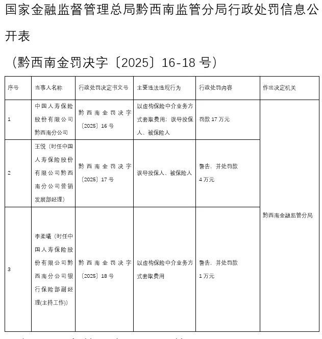 因公布的处罚信息显示,中国人寿保险股份有限公司黔西南分公司存在“以虚构保险中介业务方式套取费用”这一违规行为,还存在“误导投保人、被保险人”的违规行为,所以被处以罚款17万元。其中,相关责任人王悦被警告并处罚款4万元,另一相关责任人李柔曦被警告并处罚款1万元。