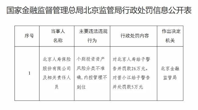 显示的处罚是北京监管局公布的,北京人寿保险股份有限公司,因其个别投资资产风险分类不准确,以及内控管理不到位,所以被给予警告,并且还被罚款26万元。相关责任人员晋小江,则被给予警告,同时被处罚款5万元。
