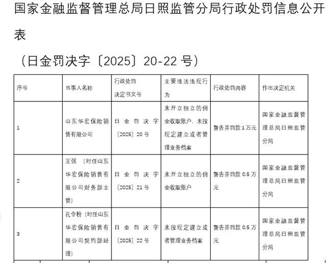 山东有个地方叫日照,那儿有个机构是国家金融监督管理总局日照监管分局,这个分局对山东的华宏保险销售有限公司以及相关的责任人作出了处罚,这家公司由于没去开立独立的佣金收取账户,还没有按照规定去建立或者管理业务档案,所以被给予警告并且罚款1万元,当时担任财务部主管的王强因为没去开立独立佣金收取账户被警告还罚款0.5万元,当时担任契约部经理的孔令粉因为没能按照规定建立或者管理业务档案被警告且罚款0.5万元。