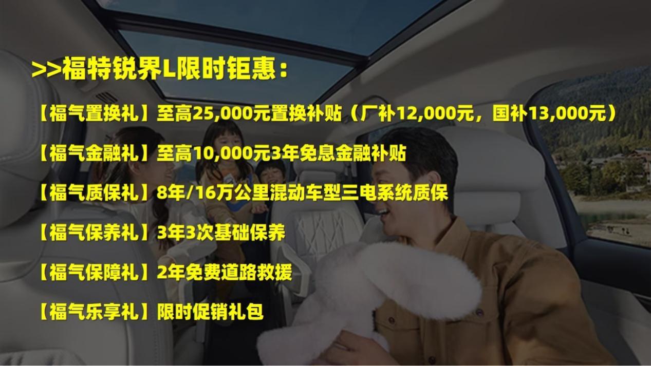 按照最新消息来看,当下锐界L所拥有的综合优惠,达到了最高超过5万元这样子(这其中涵盖了置换补贴以及金融补贴等各类补贴款项);锐界L入门版别的实际成交价格有力地朝着下方探落抵达20万之内的范围区域内;并且还能享受到0利率的金融方案以及数额最高达到45,888元的购车礼遇;它实实在在是能够用来解锁暑假期间整个家进行一起出游的理想座驾选择呢;限时的巨额优惠实行先来先得的原则 !
