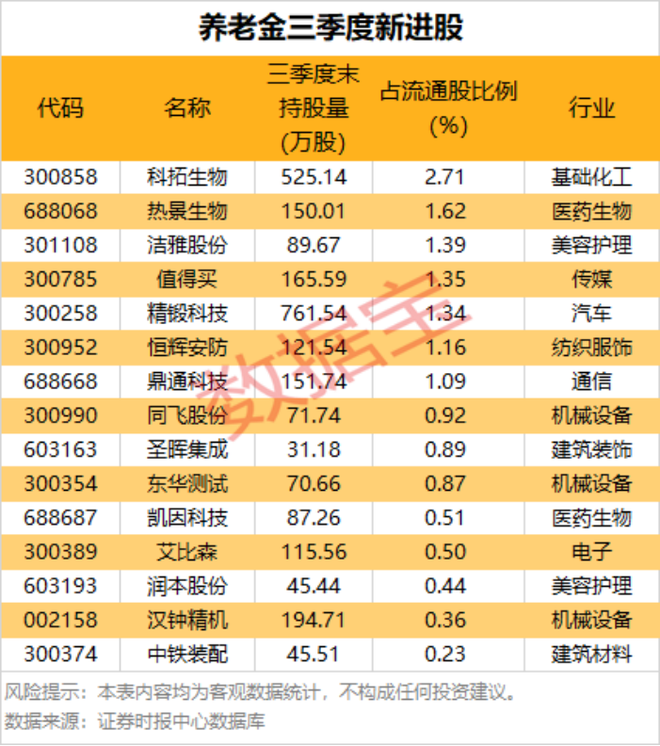 在新进的股票当中,养老金账户持有股票比例占据最多的那一只股票是科拓生物,它的持股比例是2.71%,热景生物以及洁雅股份等股票的持股比例处于较为靠前的位置。