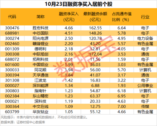 在个股方面,于10月23日,有384只出现了获融资净买入千万元以上的情况,其中有17只的融资净买入额超过了1亿元。胜宏科技的融资净买入额处于首位,在当日净买入了4.66亿元;排在其次的是中芯国际以及阳光电源,它们的融资净买入金额分别是4.51亿元、2.50亿元;融资净买入金额处于前列位置的还有赣锋锂业、德明利、中际旭创等 。