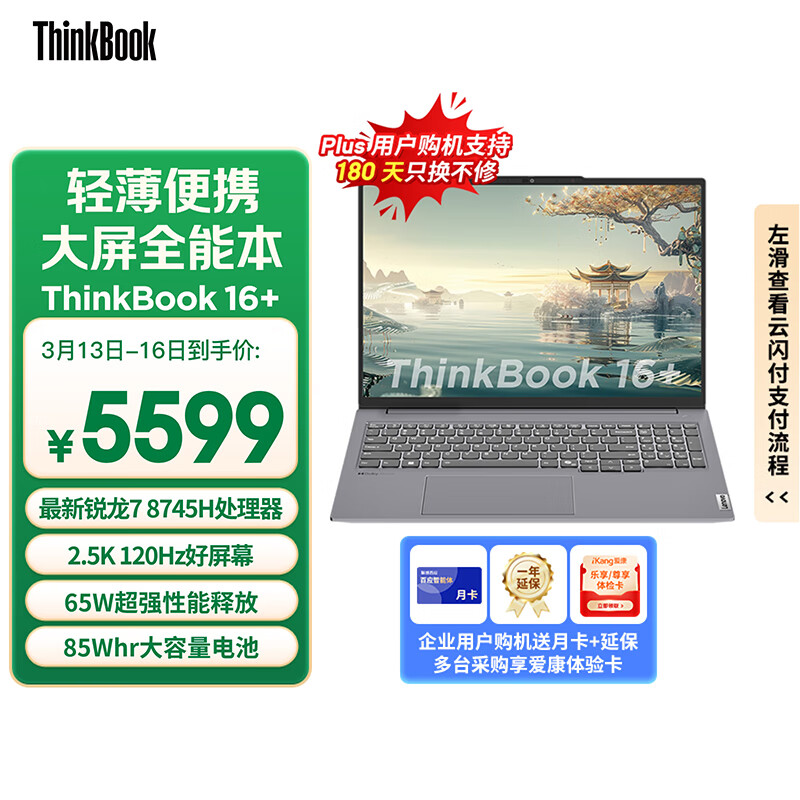 联想品牌的ThinkBook 16+这款全能本,属于ThinkPad系列,搭载锐龙7 R7 - 8745H处理器,具备24G运行内存,512G存储空间,配备2.5K高刷屏,享受国家补贴20% 。