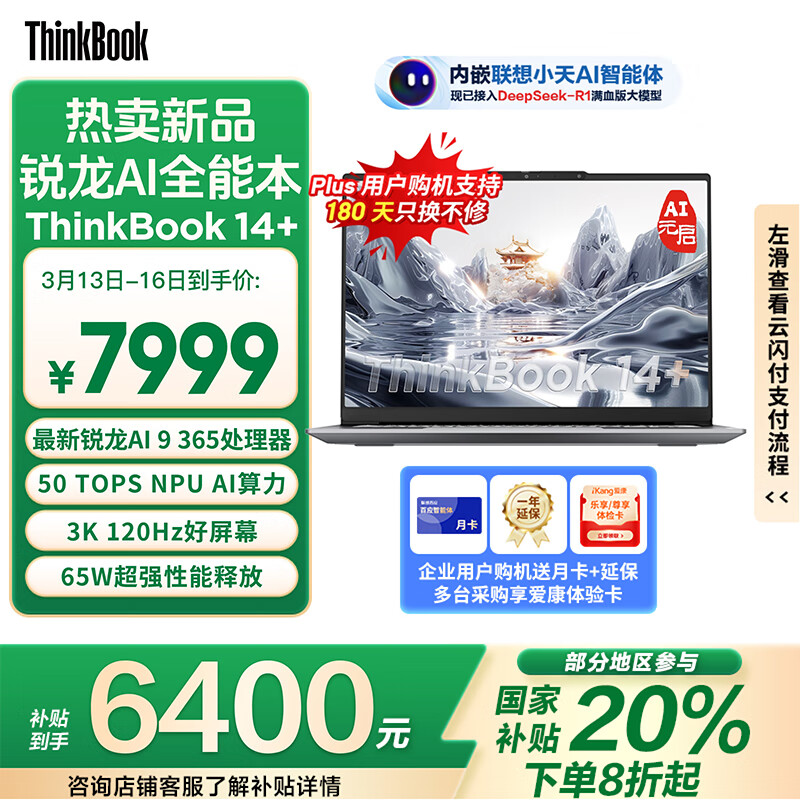 联想品牌的笔记本电脑ThinkBook 14+ 2025 AI元启版,属于ThinkPad系列,配备锐龙AI 9 365处理器,有32G内存、1T存储,具备3K高刷屏,享受国家补贴20% 。