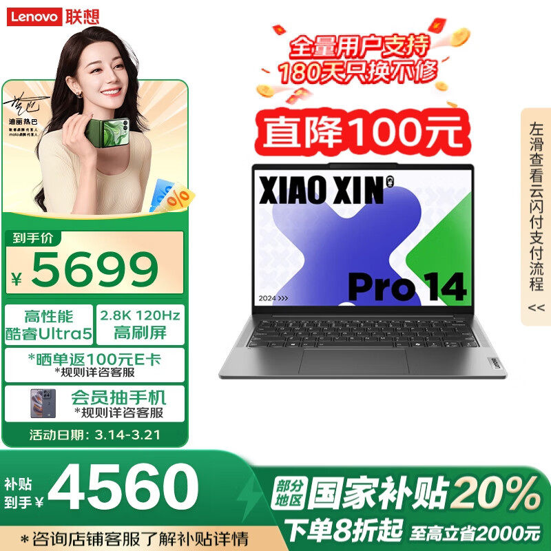 联想小新Pro14这款笔记本电脑,它属于AI超能本,它是高性能轻薄本,其搭载酷睿Ultra5,它有32G内存,它有1T存储,它配备2.8K高刷屏,它可用于游戏,它享受国家补贴20% 。