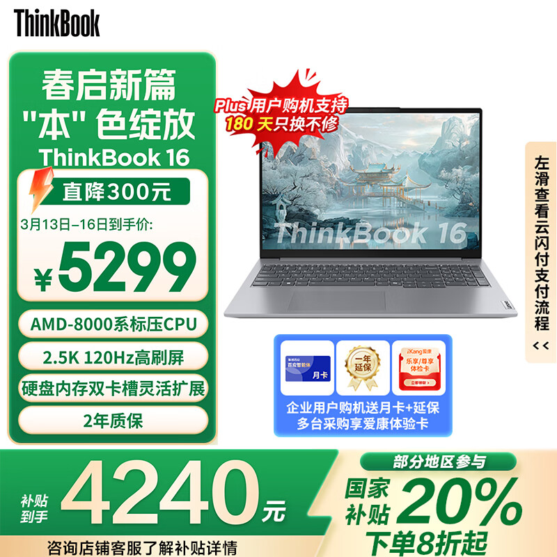 旨在办公的联想笔记本电脑ThinkBook 16锐龙版,拥有R7 - 8845H处理器,配备16英寸屏幕,具备16G内存、1T存储,还有2.5K的AI高刷屏,且享受国家补贴达20%,它隶属于ThinkPad系列 。